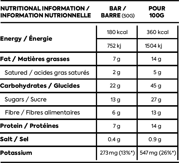 Date paste, Brown rice syrup, Organic evaporated cane sugar, Sunflower seeds, Cocoa powder, Chicory root fiber, Rolled oats, Natural flavours, Organic rice flour, Soy protein isolate, Spray dried instant coffee, Sprouted brown rice protein, Pea protein isolate, Cocoa butter, Gum arabic, Unsweetened chocolate, Cocoa nibs, Salt, Sunflower seed oil, Mixed tocopherols. Contains: Soybeans, oats. May contain: Wheat, Milk, Eggs, Peanuts, Tree nuts, Sesame Seeds.